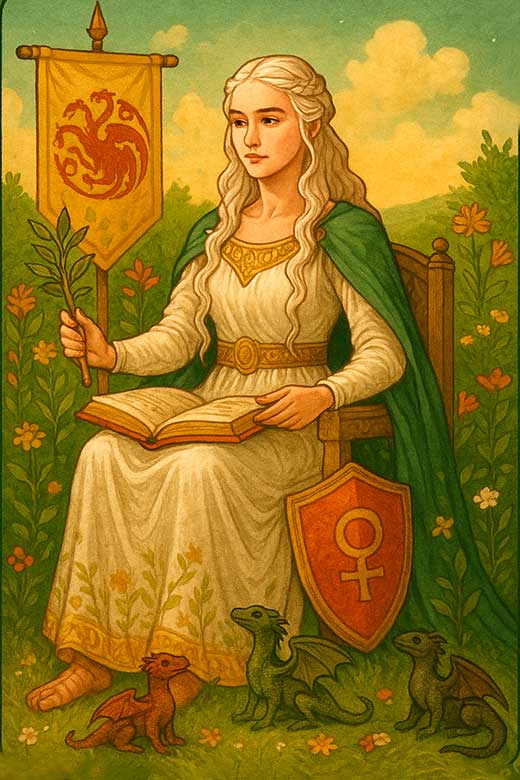 La Emperatriz es el arquetipo de la creación, de la fertilidad en todas sus formas y del liderazgo que da vida, inspira y hace florecer lo que toca. Representada por Daenerys Targaryen, esta carta se viste de fuego, maternidad simbólica y poder visionario. Dany es la madre de dragones, la liberadora, la constructora de nuevos mundos: su fuerza no es solo política, sino profundamente generativa.
