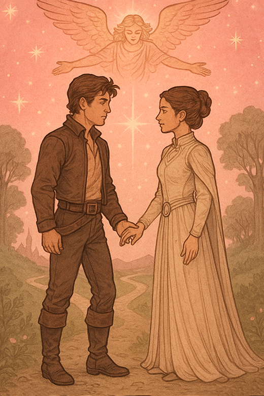 Los Enamorados simbolizan la unión de fuerzas complementarias, la elección consciente y la alineación entre deseo y dirección. Representados por Han Solo y la Princesa Leia, esta carta encarna la tensión creativa entre dos naturalezas distintas —lo impulsivo y lo racional, lo rebelde y lo institucional, lo emocional y lo estratégico— que, al unirse, generan una potencia extraordinaria.