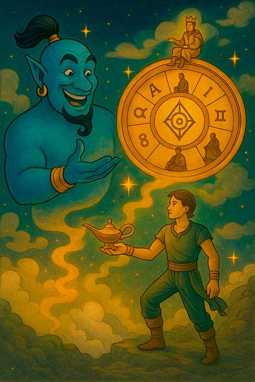 La Rueda de la Fortuna representa los giros inevitables del destino, los ciclos que se abren y cierran, y las oportunidades que aparecen cuando menos se esperan. El Genio de la Lámpara encarna este arquetipo con una energía vibrante y transformadora: su magia cambia por completo la realidad de quien lo invoca, trayendo giros radicales, expansivos y, muchas veces, impredecibles.