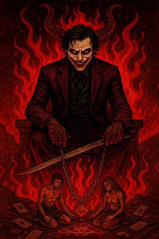 El Diablo simboliza aquello que encadena: obsesiones, adicciones, dependencias y dinámicas de poder que distorsionan la voluntad. Representado por el Joker, esta carta adquiere una fuerza perturbadora y necesaria: es el espejo que revela la parte caótica, seductora y destructiva que puede infiltrarse en una organización cuando no se gestiona conscientemente.